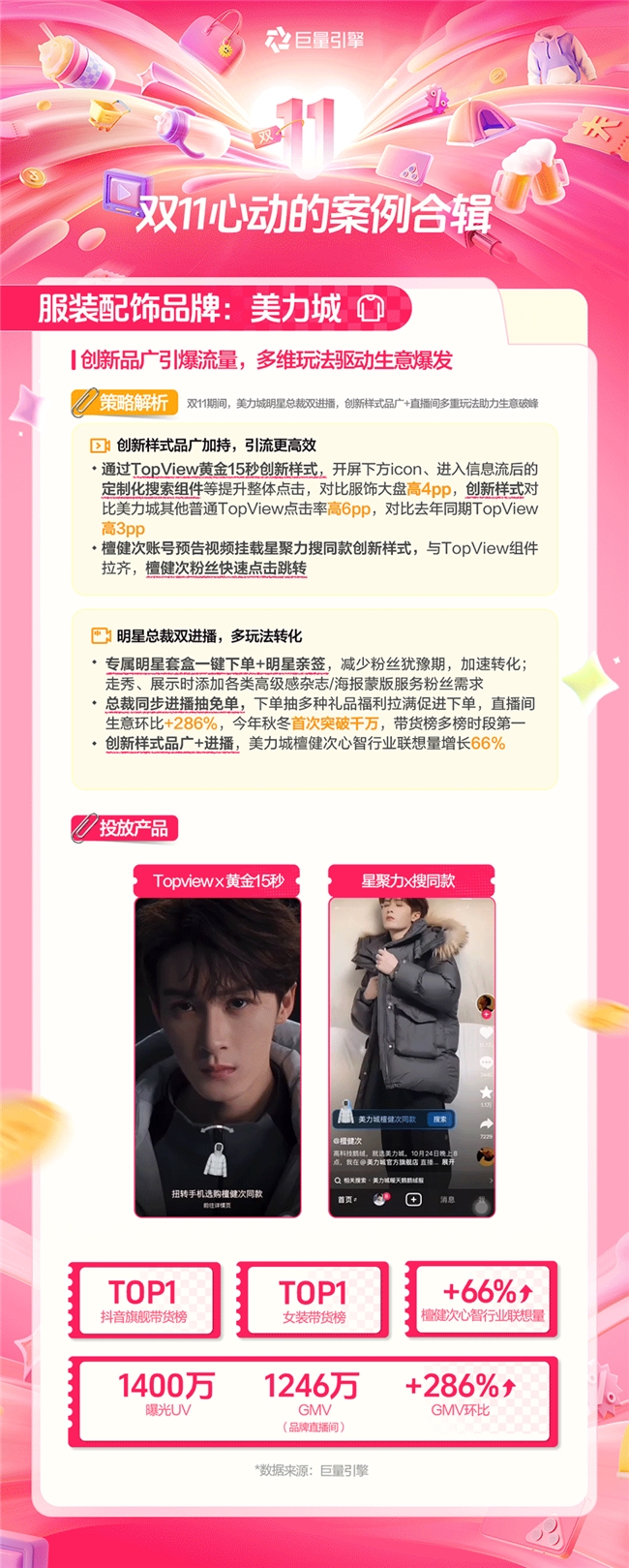 爆发力与转化力齐飞的明星营销样本。美力城借助TopView黄金15秒创新样式叠加明星总裁“双进播”玩法,不仅点击率显著高于行业均值,更实现直播生意环比增长286%,成功撬动大促声量与销量双峰值。