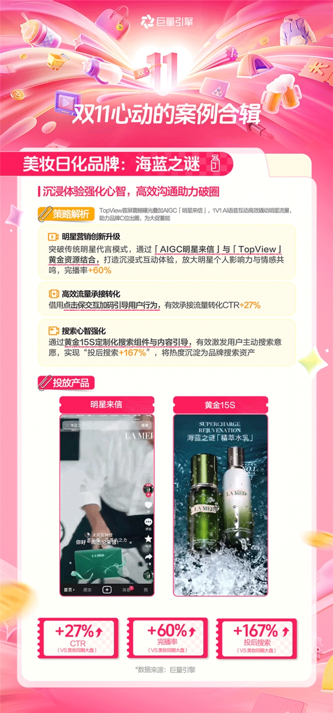 明星营销不止代言,更要共鸣。海蓝之谜将AIGC「明星来信」与TopView黄金资源融合,打造1V1语音互动体验,放大情绪连接与品牌心智。CTR+27%、搜索提升167%,创新内容让高端品牌对话更“触心”。