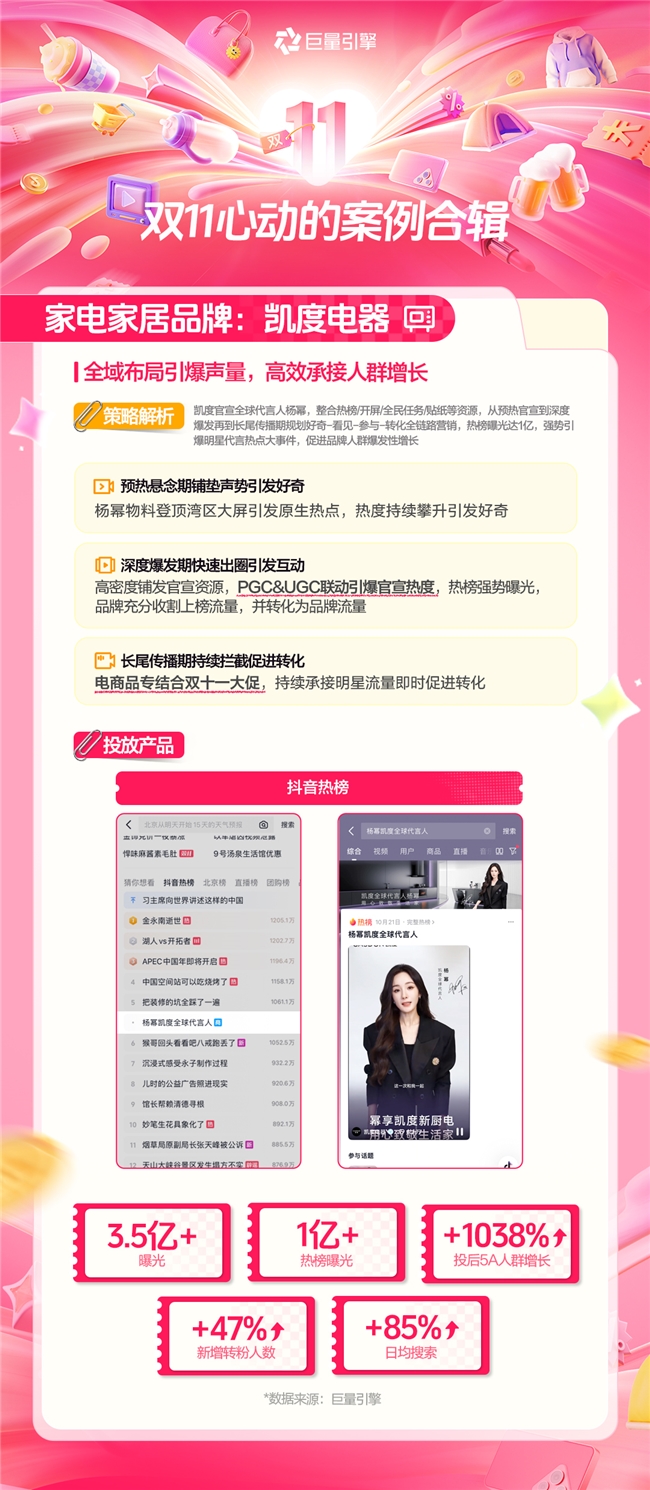 凯度电器携手杨幂,从湾区大屏预热到全民任务互动,打通“看见—参与—转化”的完整链路。热榜曝光破亿、品牌声量与转化双爆发,明星事件效应成为拉动品牌人群增长的新引擎。