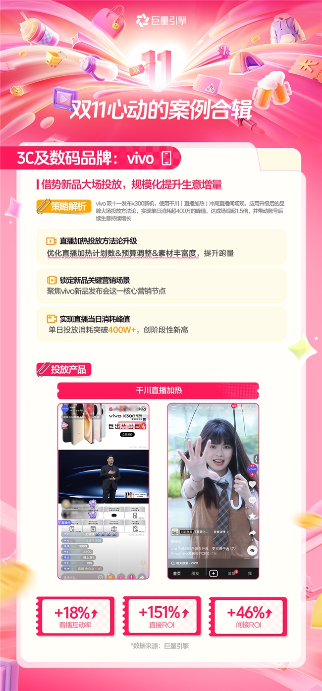 新品发布即生意爆点。vivo通过「千川直播加热」产品,围绕新品发布节点,优化投放结构与预算节奏,实现单日消耗超400万、场观提升1.5倍。大场投放方法论升级,让新品热度转化为持续生意力。