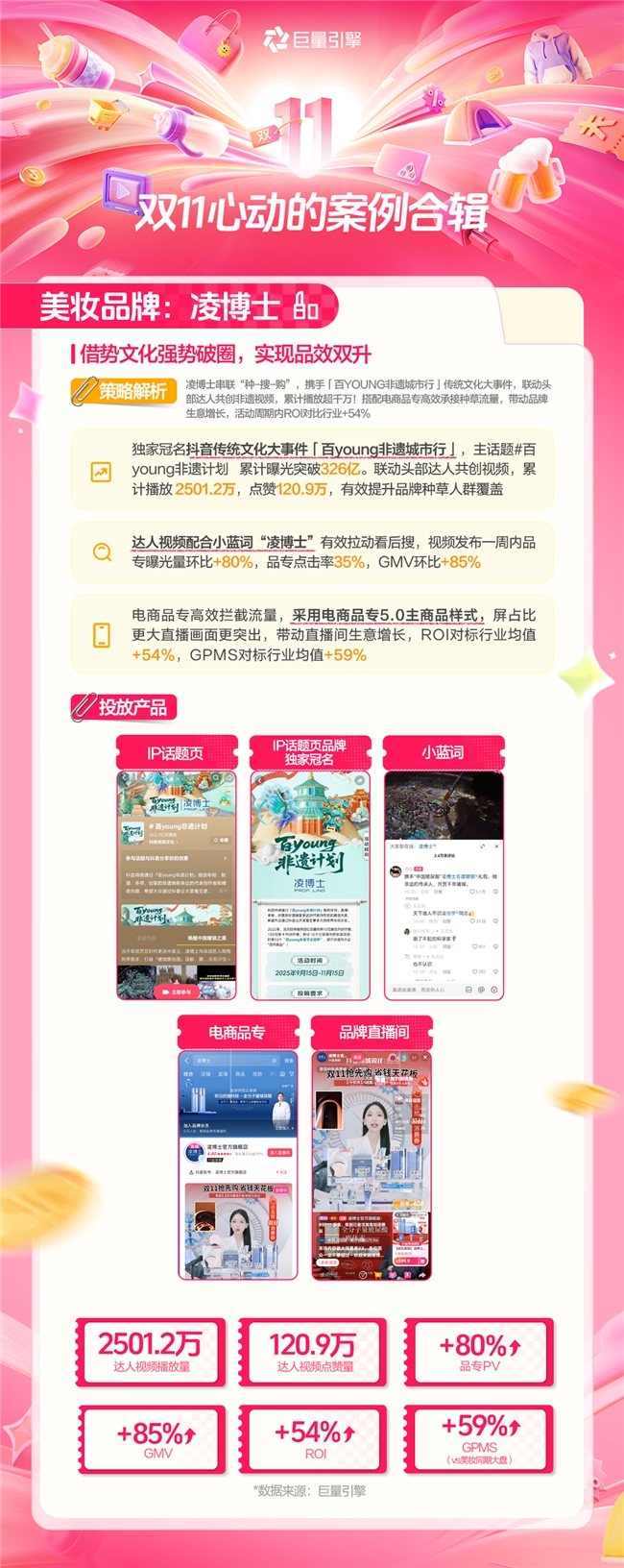 文化共创,为品牌注入长尾势能。凌博士冠名抖音「百young非遗城市行」,联动达人共创非遗视频,累计播放超千万;并通过电商品专高效承接流量,ROI对标行业均值+54%,以文化热度驱动商业高增。